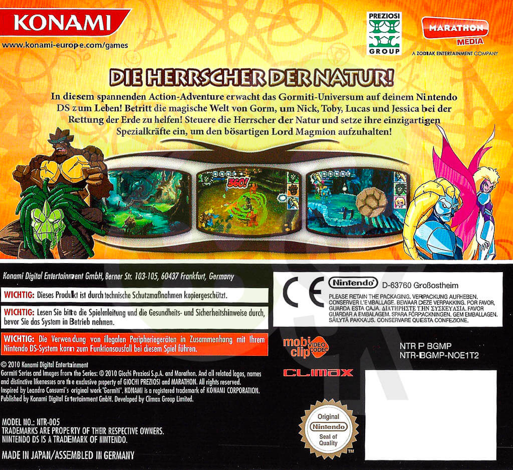 In diesem spannenden Action-Adventure erwacht das Gormiti-Universum auf deinem Nintendo DS zum Leben! Betritt die magische Welt von Gorm, um Nick, Toby, Lucas und Jessica bei der Rettung der Erde zu helfen! Steuere die Herrscher der Natur und setzte ihre einzigartigen Spezialkräfte ein, um den bösartigen Lord Magmion aufzuhalten!